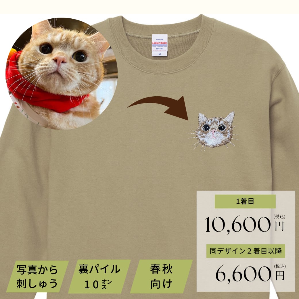【写真から仕立てる毛並み刺繍トレーナー春秋向け】の制作枠受付ページです。